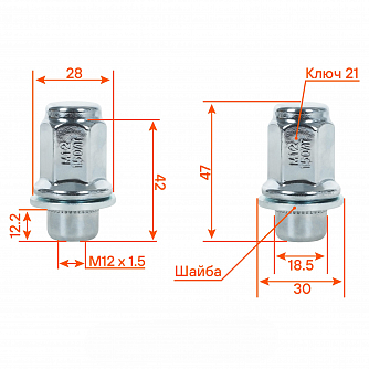 - Гайка колесная M12x1,5x47, несъемная шайба, ключ 21, закрытая, хром, 1 шт для Toyota/Lexus